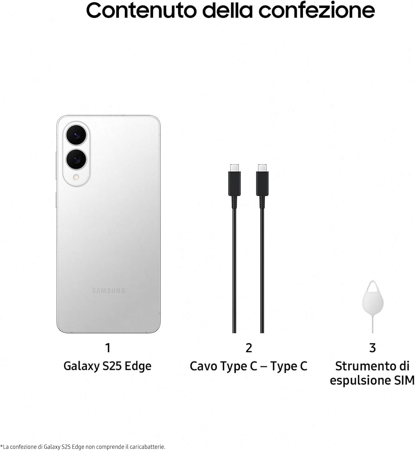Samsung Galaxy S25 Edge. Dimensioni diagonale schermo: 17 cm (6.7"), Risoluzione del display: 3120 x 1440 Pixel. Frequenza del processore: 3,5 GHz, Famiglia processore: Qualcomm Snapdragon, Modello del processore: 8 Elite. Capacità della RAM: 12 GB, Capacità memoria interna: 256 GB. Risoluzione fotocamera posteriore (numerico): 200 MP, Tipo di fotocamera posteriore: Doppia fotocamera. Capacità della scheda SIM: Doppia SIM. Sistema operativo incluso: Android 15. Capacità della batteria: 3900 mAh. Colore del prodotto: Argento. Peso: 163 g